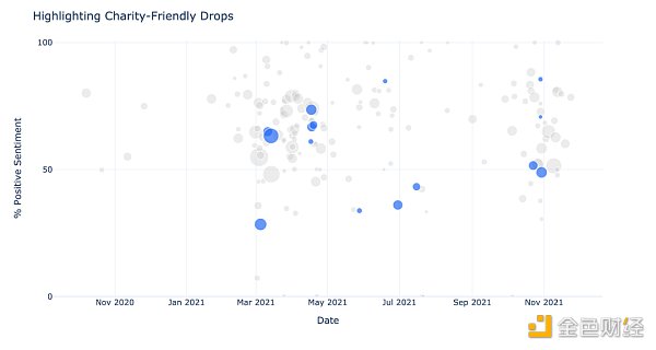 依據我們選取的數據集來看,NFT 項目是否提及其慈善事業(或意圖)對粉絲情緒的總體走勢影響甚微(如下圖所示)。事實上,甚至有少數幾個慈善性 NFT 發行項目被標記為「負面情緒占比更大」。例如,2021 年 3 月 Charli XCX 在 Foundation 上發行的 NFT 項目,該項目將部分收益捐贈給了 Girls Make Beats。這種粉絲情緒走勢與整個音樂行業(及 W&M 社區內部)基本吻合。顯然,僅在 NFT 項目發行初期加入慈善元素,并不足以打消粉絲對該產業形式的種種疑慮,也無法解決加密新手一貫面臨的財務成本和技術障礙問題。