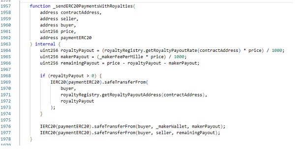 在fillSellOrder函數中,攻擊者可以指定出售的NFT地址,并且在驗證中只驗證了攻擊者的簽名,而未驗證買方的簽名。那么攻擊者可以通過驗證,并在調用_fillSellOrder函數時,將攻擊合約的NFT轉移給買方,并執行_sendERC20PaymentsWithRoyalties函數轉移買方向合約授權的ERC20代幣
