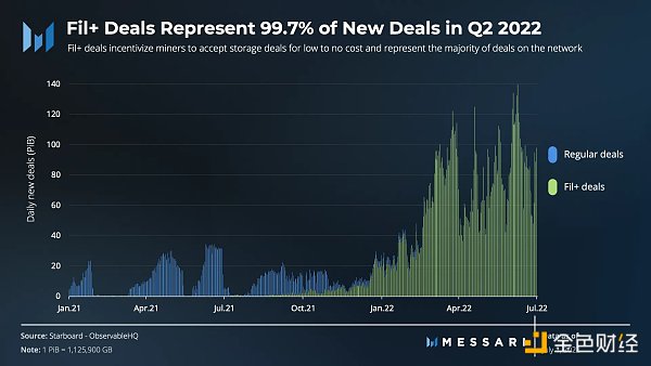 自2021年第四季度以來,已經從Filecoin Regular(未經驗證的數據交易)過渡到由Filecoin Plus(經過驗證的數據交易)占主導地位。這一轉變對應著Filecoin Plus交易的持續上升趨勢。2022年第二季度,Filecoin Plus交易占所有新交易的99%以上。Filecoin Plus交易對Filecoin Regular交易的翻轉,加上新交易的大量增加,表明經過驗證的數據激勵機制正在按計劃運作。