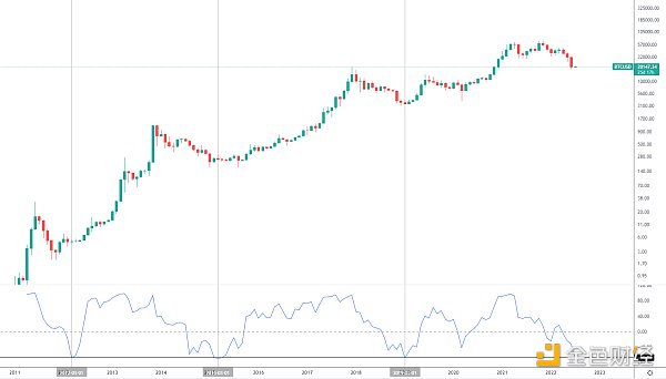 如圖為BTC月線長期走勢,我們看下方動量指數再次從高位回落至平衡線一帶,前期歷史一旦跌至平衡線位置,BTC均處于各輪熊市底部區域,后面便是長達數月的低位盤整,持續消磨持幣者的信心和耐心后啟動牛市行情,所以后面觀察本輪能否再次走出底部形態。