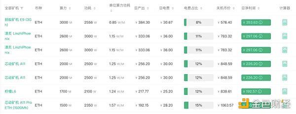 以 E9 為例,antpoolminer?數據顯示,其算力可達 2400M,功耗 1920w ??遠超顯卡 RX580 8卡(240 M,1200W),并且單位算力功耗是后者的 1/6;E9 也是目前挖礦收益最高的機器,單日挖礦收益 53 USDT,關機幣價為 88 USDT。