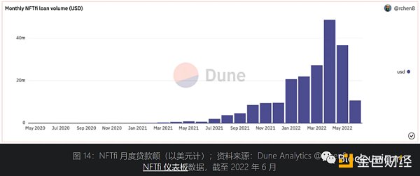 NFTFI 于 2020 年 6 月推出了公開測試版。它在 2020 年發放了 300,000 美元的貸款,2021 年發放了 4,000 萬美元,2022 年迄今發放了 1.66 億美元 (見圖 14)。貸款期限從 30 天到 180 天不等,年利率從 30% 到 100% 不等。貸款是一次性償還的。典型的貸款與價值比率約為 50%,NFTFI 向貸款人收取非違約貸款利息的 5%。