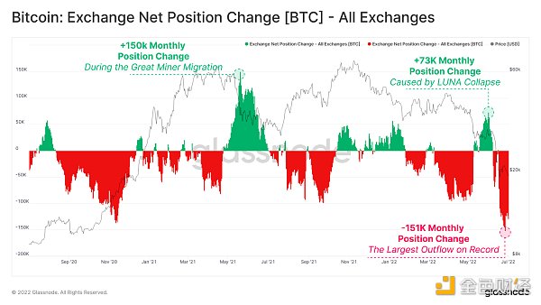 伴隨著歷史上糟糕的價格表現,交易所出現了有史以來最大的月度下降,達到了15萬BTC/月的流出率。這占到6月份典型余額減少的5.0%至6.0%,與2021年5月至6月發生的大量代幣涌入交易所的情況形成鮮明對比。