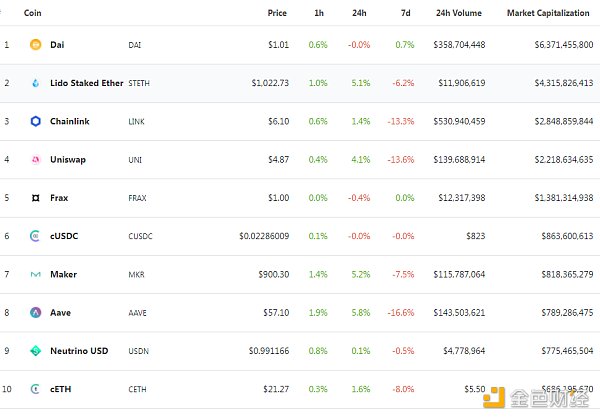 DeFi項目鎖定資產前十排名及鎖倉量 數據來源:defillama
