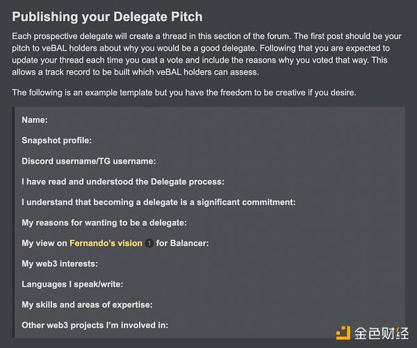 任何人都可以成為代表。協議的申請涉及填寫由特定 DAO 提供的模板,例如下面看到的 Balancer 申請模板。這些申請可能是模糊的,但有些申請,例如 Balancer,存在需要對協議及其愿景進行進一步研究的問題。