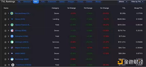 生態項目中,PancakeSwap 占據了 48.86%,TVL 占比前十的項目中,幾乎都是 BSC 鏈的原生項目,且其中 7 個項目已上市 Binance 交易平臺。