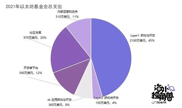 2021 年,以太坊基金會總支出大約 4800 萬美元。其中約有 2000 萬美元是以外部支出的形式,包括贈款、委托領域分配、第三方資金、賞金和贊助。