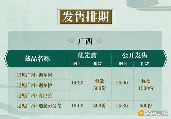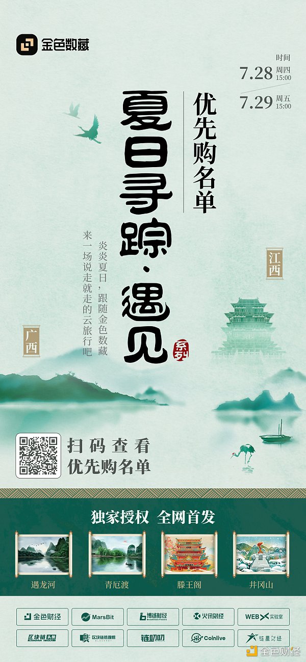 XRP/HKD-2.5%金色數藏即將推出2期數字藏品,與遇龍河景區旅游發展有限公司、賀州博物館聯合鑄造的「夏日尋蹤 · 遇見廣西」主題藏品,將于7月28日15:00正式發售。與江西電視臺聯合鑄造的「夏日尋蹤 · 遇見江西」主題藏品,將于7月29日15:00正式發售。