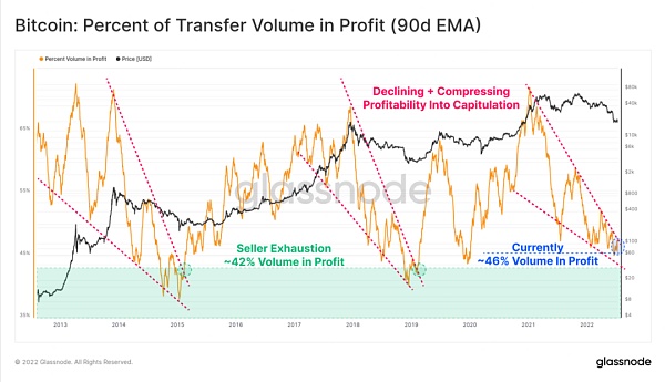 轉讓量占利潤的比例也具有類似以往熊市低點的市場結構。在2015年和2018年的拋售期,用戶虧損了超過58%的轉讓量,在數月的看跌價格走勢后,下跌勢頭最終受到阻止。