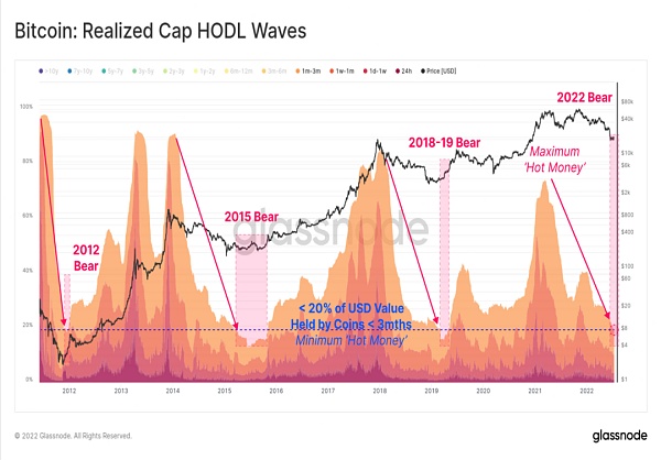 最后,對較舊的一批比特幣,我們可以看到其中80%以上的美元財富已被持有超過3個月(在LUNA崩潰之前獲得)。在持有它們6個月-1年和1年-2年的人群強烈推動下,這一趨勢繼續增加。盡管絕大多數拋售和被迫售出比特幣的賣家來自這些6個月-2年的群組。
