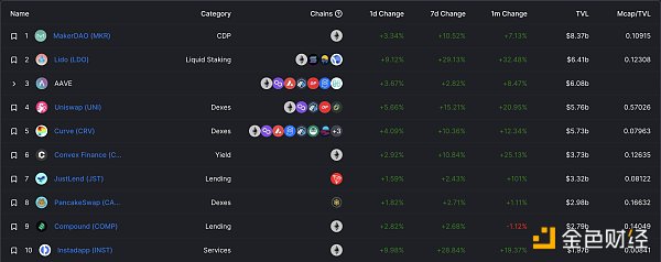 DeFi項目鎖定資產前十排名及鎖倉量 數據來源:defillama