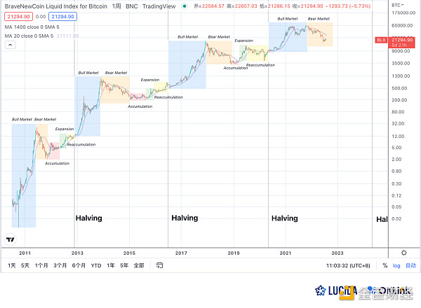 每輪減半周期分為 5 個階段,分別是牛市、熊市、積累、擴張和再積累;