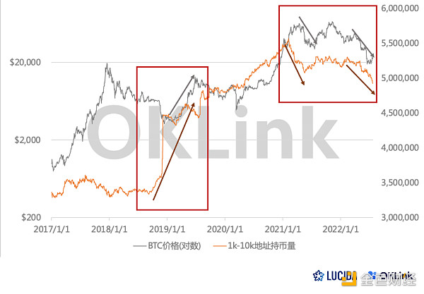 1k-10k BTC 地址持幣量 vs BTC 價格