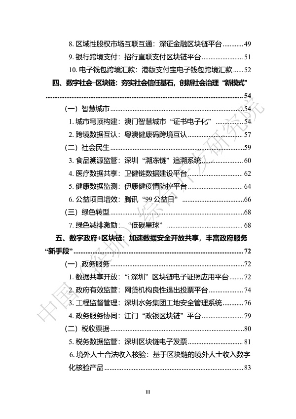 作為一大亮點,報告引用了大量基于FISCO BCOS,并在粵港澳大灣區落地的應用案例:在數字經濟發展方面,“粵澳跨境數據驗證平臺”、“灣區金融科技人才鏈”、“珠三角征信鏈”、“深證金融區塊鏈平臺Capital BCOS”等案例入選;在數字社會建設方面,“澳門智慧城市建設之證書電子化”、“粵澳健康碼跨境互認”、“騰訊99公益日”等案例入選;在區塊鏈推動數字政府建設方面,“網貸機構良性退出投票平臺”、“區塊鏈司法存證仲裁服務平臺”、“深圳水務集團工地安全管理系統”、“智慧司法區塊鏈留痕系統”等案例入選。