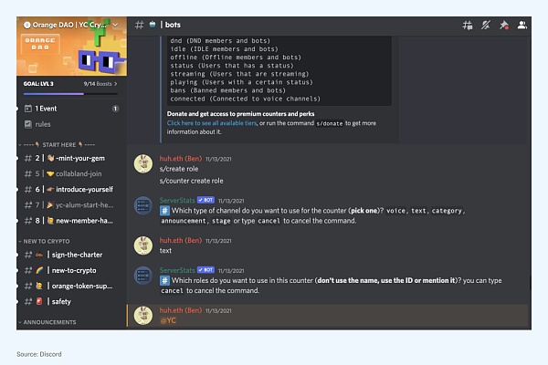 社區空間能不能讓初來乍到的新人輕輕松松就能摸清門道,愿意在其中消磨時間?給頻道簡單地編個號,直觀地列出新成員該先做哪幾步,是引導ta們上手的便捷方式。漂亮的版面設計能也為你贏得加分。crypto collective Orange DAO(譯注:幫助初創公司進入 Y Combinator 并提供其他孵化服務的組織)的 discord 服務器設計十分友好,對新人很有吸引力。