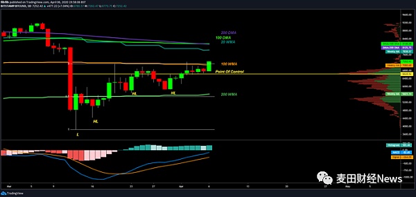 另一方面,比特幣在站穩100周均線之后,接下來會面臨一個非常大的考驗,也就是20周均線(7855美元),該水平一直以來都被認為是比特幣的牛熊分界線。