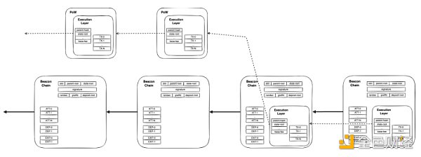 等到信標鏈合并到以太坊主網,以太坊的PoW共識層將被替換成信標鏈(PoS),交易狀態則是繼承自原以太坊主網。