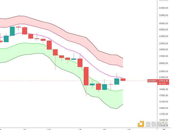 我們可以看到前期熊市,BTC月線重新站上下壓趨勢線,后面一般才會走出新一輪牛市行情,例如2015-2017牛市、2019牛市和2020-2021牛市,而現在由于上月大跌形成大陰柱,目前價格顯然距離上方趨勢線較遠,本月迎來超跌反彈,后續隨著時間推移,下壓趨勢線將逐步下移,BTC維持區間震蕩后面將有重新站上的機會,所以還需時間。