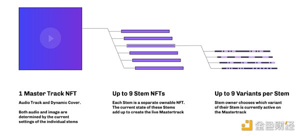 Async.Art 將音樂分成了不同音軌(即 Stem), 結合了 PFP 生成藝術的玩法,買家可以購買單一音軌 NFT 并選擇 Stem 的狀態(Variant), 之后 master 本體音樂呈現的狀態就取決于每一個 Stem 所有者。如下圖 MozartBeats 共有四種音軌,每種音軌下有五種狀態,可以組合出 625 種不同的音樂。其他參與者可以通過購買空白唱片錄音記錄下不同狀態的音樂,唱片分為鉑金唱片,金唱片,銀唱片,稀有度不同但功能相同,錄音之后可以在二級市場售賣。可組合音樂未來或許可以引入稀有度和二次創作等要素,擁有更多元的玩法,而非單個音樂 NFT 的售賣,收藏單一音軌或 layer 也可能是另一種收藏策略。