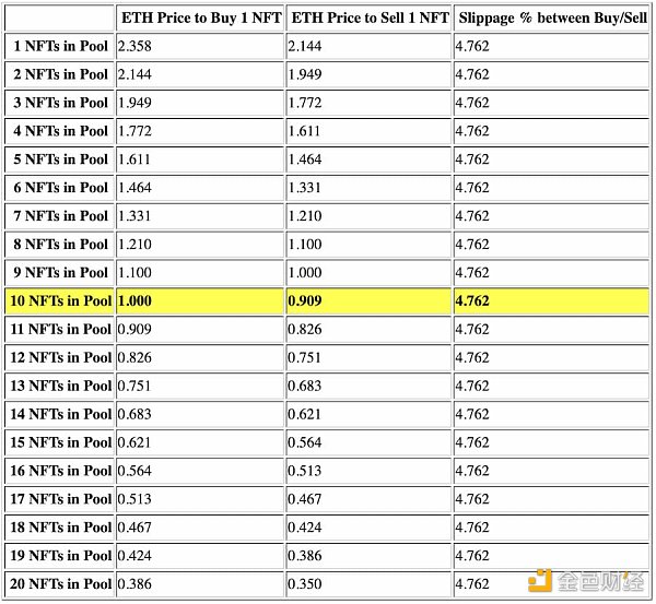 x*y=k 池子中,交易者每購買或出售一個 NFT 時所需的 ETH