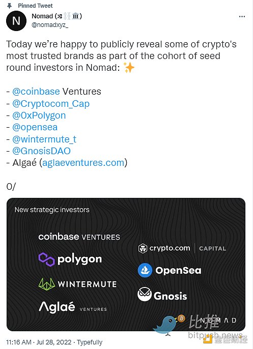 Nomad 在今年早些時候推出,是 Evmos 和 Moonbeam 區塊鏈的主要跨鏈橋,但也在以太坊、Avalanche 和 Milkomeda C1 上占有一席之地。它擁有強大的風險投資支持,最近宣布從Coinbase、Polygon、OpenSea和Crypto.com等該領域最大的一些公司那里籌集了2250萬美元的資金。此外,他們于 2022 年 6 月接受了領先的區塊鏈和智能合約審計公司之一 Quantstamp 的審計。
