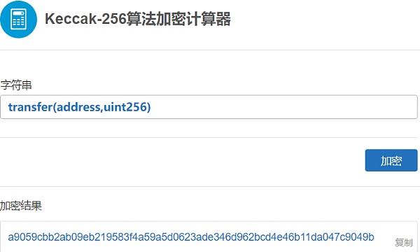bytess4(keccake256("transfer(adddress,uint256)"))或者在線工具獲取這種函數簽名。下圖可以看出加密結果的前四個字節 (a9059cbb) 跟 input data 中函數標識符一致。