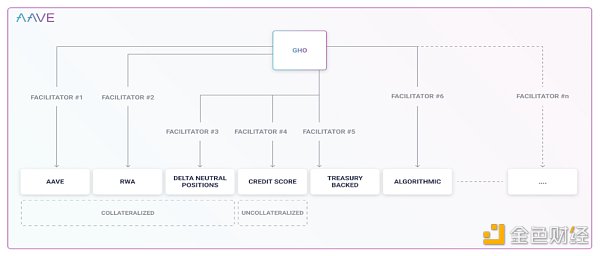 看那個圖便一清二楚,通過引入Facilitator,GHO有了多個場景的鑄造,除了傳統的超額抵押,還有RWA現實世界資產抵押,類似資管的Delta Netural中性交換策略,甚至有基于信用分數的無抵押貸款……
