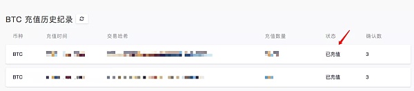 5、回到 OTCBTC,在我的賬戶頁面,點擊「充值」按鈕,在[BTC 充值歷史記錄]中查看這筆交易,狀態顯示[已充值]說明充值已經到賬。