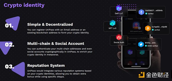 Unipass 是一個多鏈統一加密身份,即元宇宙通用護照,用戶可以通過一個 Unpass ID 聚合多個社交(Web2)賬號,給予用戶評分、標簽、展示用戶的 NFT、支持基于電子郵件的社交身份恢復,以及支持基于 Token 的社群、zoom 會議、論壇訪問。支持向特定 Token 持有者發送消息。