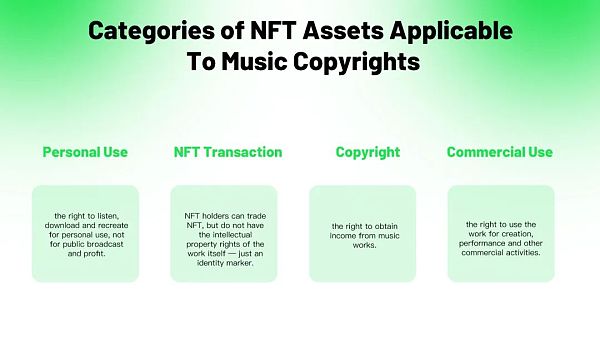 所有權的轉變:音樂NFT的消費不僅僅獲得聽歌的權利,其同時帶來稀缺的數字所有權的轉變,目前音樂NFT對個人使用權、NFT轉讓權、版稅收益權、商業使用權帶來了全方位轉變。