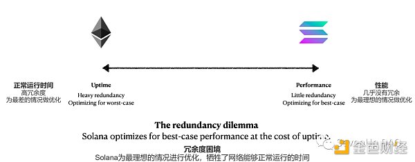 Solana選擇了性能和(相對)效率,所以它把有限的計算量都花在了最佳情況的性能上,較低的冗余度導致可靠性受到了負面影響。