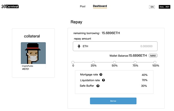 用戶Alice手中有一些NFTs,價值約為1000美元,但是她想要將其抵押,借一筆資金用于投資其他項目,她可以在XCarnival平臺上將自己的NFT設置: