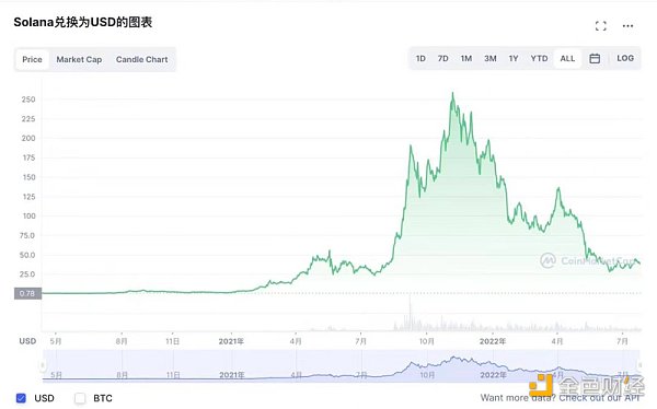 在本次流動性危機中,公鏈代幣價值也得到了大幅度削減——曾經位列加密市場第四位的Solana原生代幣SOL,從最高點250美金上方跌到了如今30-40美金附近。