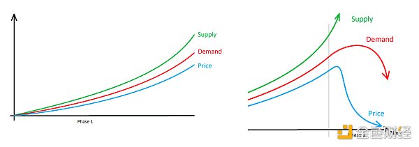 目前市場上大多數鏈游在發展到一段時間后,都會面臨經濟模型坍塌的問題,我們借用推特上的一張經典的供需模型分析來進行說明: