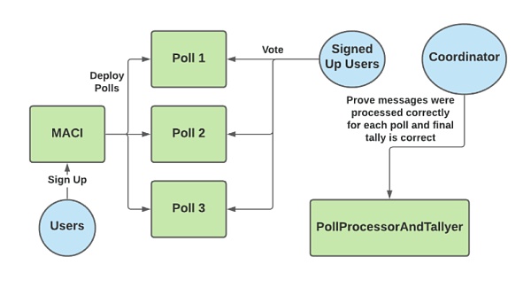 這些階段利用了3個主要的智能合約--MACI、Poll和PollProcessorAndTallyer。這些合約可以在MACI github頁面上找到。MACI合約負責通過記錄每個用戶的初始公鑰來跟蹤所有用戶的注冊情況。當投票要進行時,用戶可以通過MACI.deployPoll()部署一個Poll智能合約。