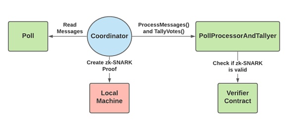 在MACI工作流程中,有兩種不同的角色:用戶(投票者)和一個受信任的協調者。用戶通過MACI智能合約在區塊鏈上投票,協調者統計票數并發布最終結果。