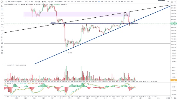 減半后開啟一路下行走勢,昨日一波縮量反彈也是未能站回前期上行通道,今日更是跌破關鍵前期上升三角上沿支撐,整體走勢進一步弱化,后面有望繼續加大回調的力度,目前價格處于30日均線附近徘徊,不過支撐力度有限,短期支撐213附近,一旦跌破就要測試強支撐200美金,目前還未止跌企穩,建議觀望,壓力227美金。
