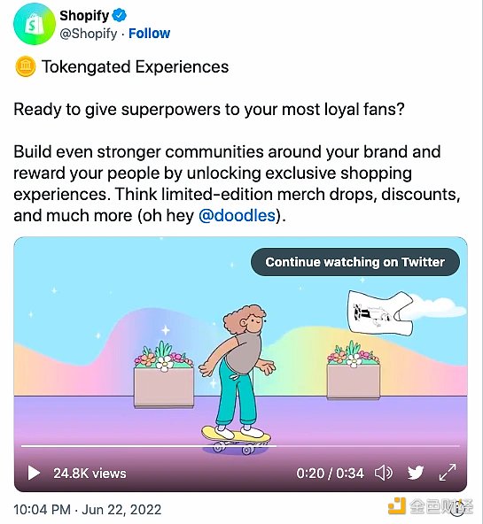 在 Shopify 發布的公告視頻中,一位旁白介紹道:“邀請你的社區進入一個認可并獎勵忠誠度的世界。”視頻中,一個玩滑板的女人穿過一個顏色淡雅的入口之后,變成了一個 Doodles NFT。