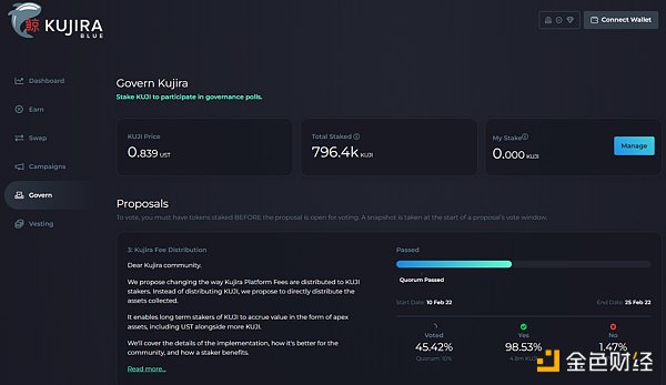早期Kujira協議是將平臺收入以代幣KUJI的形式回饋給KUJI質押者,2月下旬社區發起更改獎勵形式的投票,調整為按照平臺收入原有的資產形式分發,簡單來說就是,平臺收取的bLUNA、bETH、aUST等資產,將不會兌換為代幣KUJI,而是以原有的形式直接回饋給KUJI質押者。