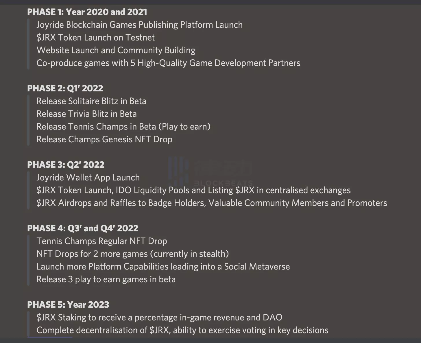 如圖所示,當前應該進展到第三階段了,主要計劃啟動 JRX Token,并在中心化交易所上幣,做 IDO 流動性池以及進行 Token 空投。第四階段中 Tennis Champs 常規 NFT Drop,且其他兩場比賽也會有 NFT Drops,平臺還會推出更多功能,可能關于社交,以及發布測試版游戲。在最后一階段中,主要實現 JRX Staking 體系,建設 DAO 達到完全去中心化,使成員可以在關鍵決策中行使投票權。