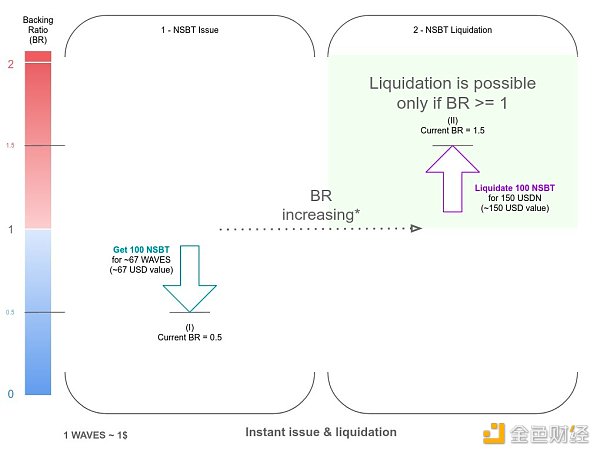 當流通的USDN過多而需求不足,USDN的價格低于1美元時,交易者也可以在市場上以較低的價格購買USDN,并通過智能合約兌換成WAVES。由于用戶購買USDN時存在折扣,可以通過這種方法完成套利,使USDN的價格升至1美元。
