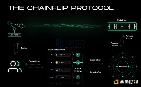 為了實現這一點,Chainflip 的設計包括一個狀態鏈,基于 Polkadot 的 Substrate 框架,作為 Chainflip 的協調機制。它包含所有與金庫內容有關的數據,以及交易進入金庫后如何處理的規則集。正是通過狀態鏈,驗證者對所有互換的狀態,流動性,以及何時何地發送出去的交易達成了共識。應用狀態鏈的規則和金庫的無信任性質,用戶可以使用 Chainflip 以無信任的方式跨鏈交換資產,從而滿足 Chainflip 的三個主要目標。