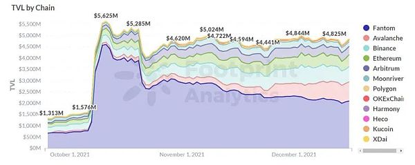 多鏈路由:成為許多用戶在執行跨鏈操作時的首選,它不會太受合約運行環境的限制,而且幣種覆蓋率高,已支持的跨鏈幣種數量已高達 1219 種。關于TVL增長,來看圖片數據,Anyswap 在不同鏈上的 TVL 增長狀況 。