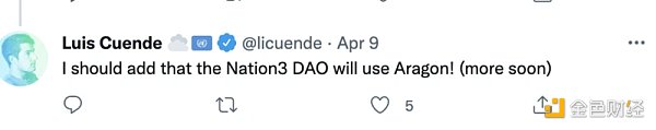 Luis Cuende 在 4 月 9 日發布推特表示要建立 Nation3。他想通過價值觀和加密經濟激勵措施來推動云上國家的建設,同時也稱仍然需要資助眾多 DAO 工具,來使云上國家可行,這將包括大量的合法黑客行為。