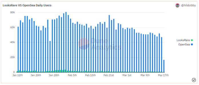 LooksRare 是建立在以太坊上的新一代 NFT 交易市場,不可避免地需要與 OpenSea 做對比。自運營以來,LooksRare 的日真實交易量大約為 OpenSea 的 2% 至 5%;日活躍用戶大約為一千多人,峰值為 3,000 人,也大約為 OpenSea 的 2% 左右。所以,總體看,LooksRare 還需要做很多努力,提高交易量和活躍用戶。從下圖可以看到大致的對比情況: