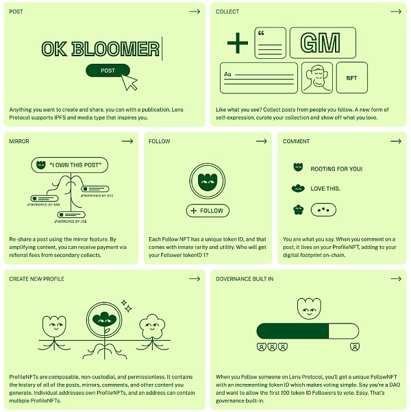 在當前的Web2.0社交媒體上,注冊賬戶、認證身份、發布內容、關注他人、評論、收藏內容都是基本功能,在Lens協議產生的社交產品中,這些功能將融入NFT技術。