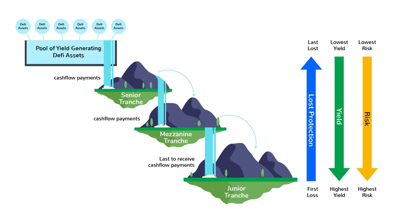 Waterfall DeFi 提供了三種不同收益率的風險分級產品;三個分級產品背后的 DeFi 資產組合相同,但具有不同的風險和回報。