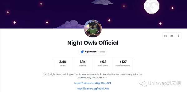 Night Owls 是一個與眾不同的 NFT 項目。我們將社區和透明度放在我們所做的一切的中心。加入我們的 Discord,訪問一個充滿活力、熱情好客的社區,該社區充滿了熱門 NFT 項目的 Alpha 版。聆聽長者委員會,我們當地的加密和 NFT 專家委員會,并向他們學習。利用他們的智慧和對資產購買的投票來增加 DAO 的金庫。被動賺取 $HOOT 以推動您參與 Night Owls 生態系統。