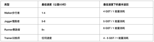 筆者3認為這樣的設計有以下意圖:防止玩家運動過度有害健康、增加玩家持有運動鞋的數量、防止GST產量過多等。能量的獲得機制可以參考一下表格