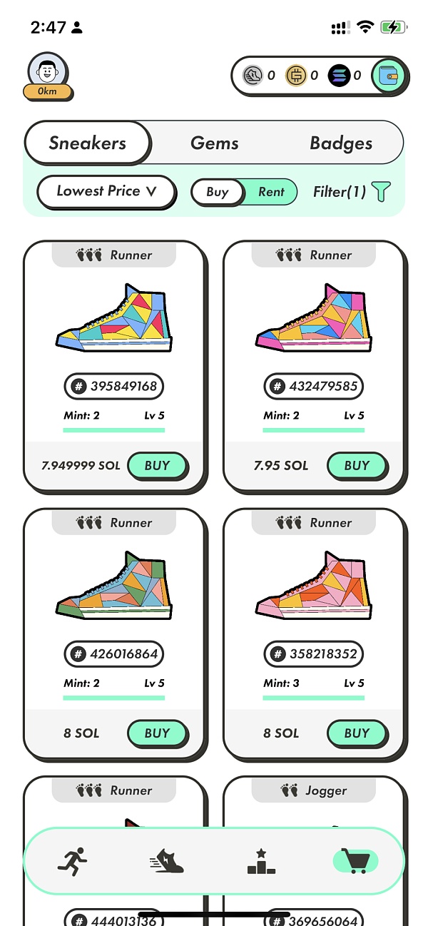 參與MovetoEarn需要擁有一雙運動鞋,總共有4 種不同類型的運動鞋,分別為Walker(步行者)、Jogger(慢跑者)、Runner(賽跑者)和 Trainer(訓練師)。